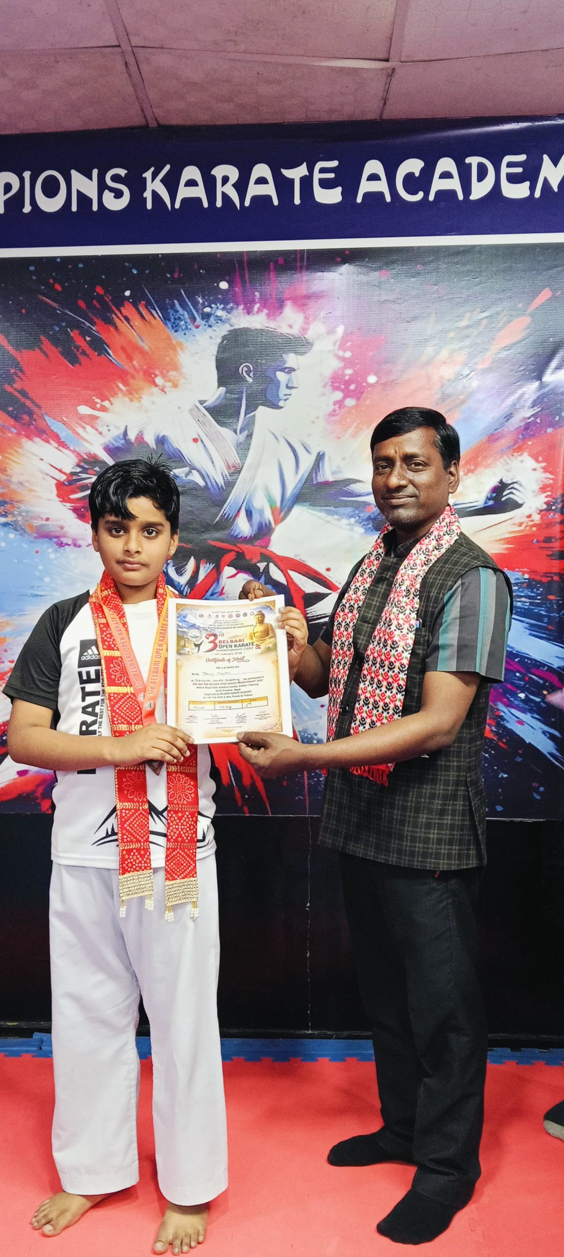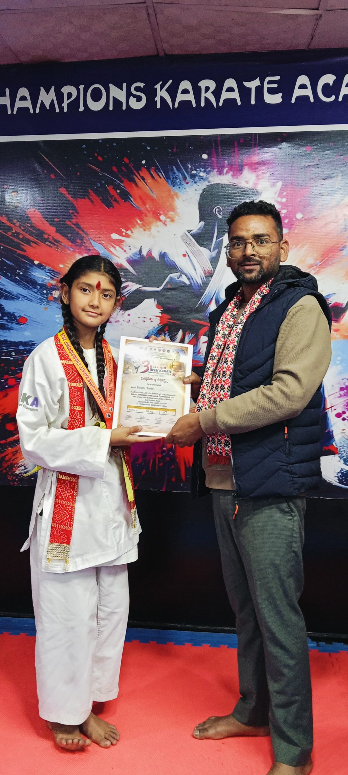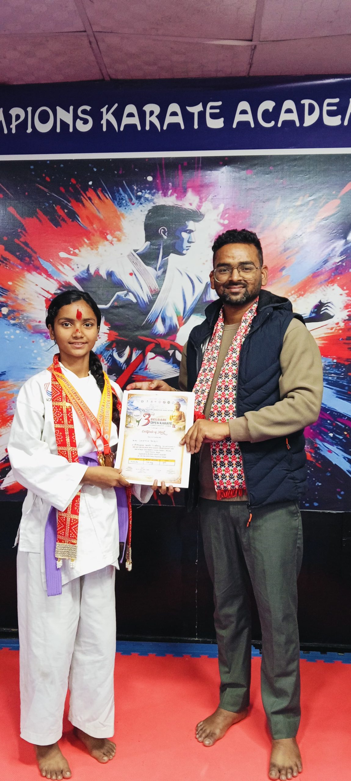 विराटनगर। विराटनगर स्थित च्याम्पियन्स कराँते एकेडेमीका खेलाडी विद्यार्थीहरूलाई एक समारोहका बीच सम्मान गरिएको छ। खेलाडीहरूलाई पारस मल्टिस्पेसिलिटी अस्पतालका प्रमुख कार्यकारी अधिकृत हेम नारायण मेहता र अस्पतालका लेखा प्रमुख इमरान अन्सारी तथा रोडशेष डेन्टल तथा ओरल केयर क्लिनिकका डा. शेखर कुमार मण्डलले खादा, टिका, मेडल तथा प्रमाणपत्र प्रदान गर्दै सम्मान गरेका हुन्।