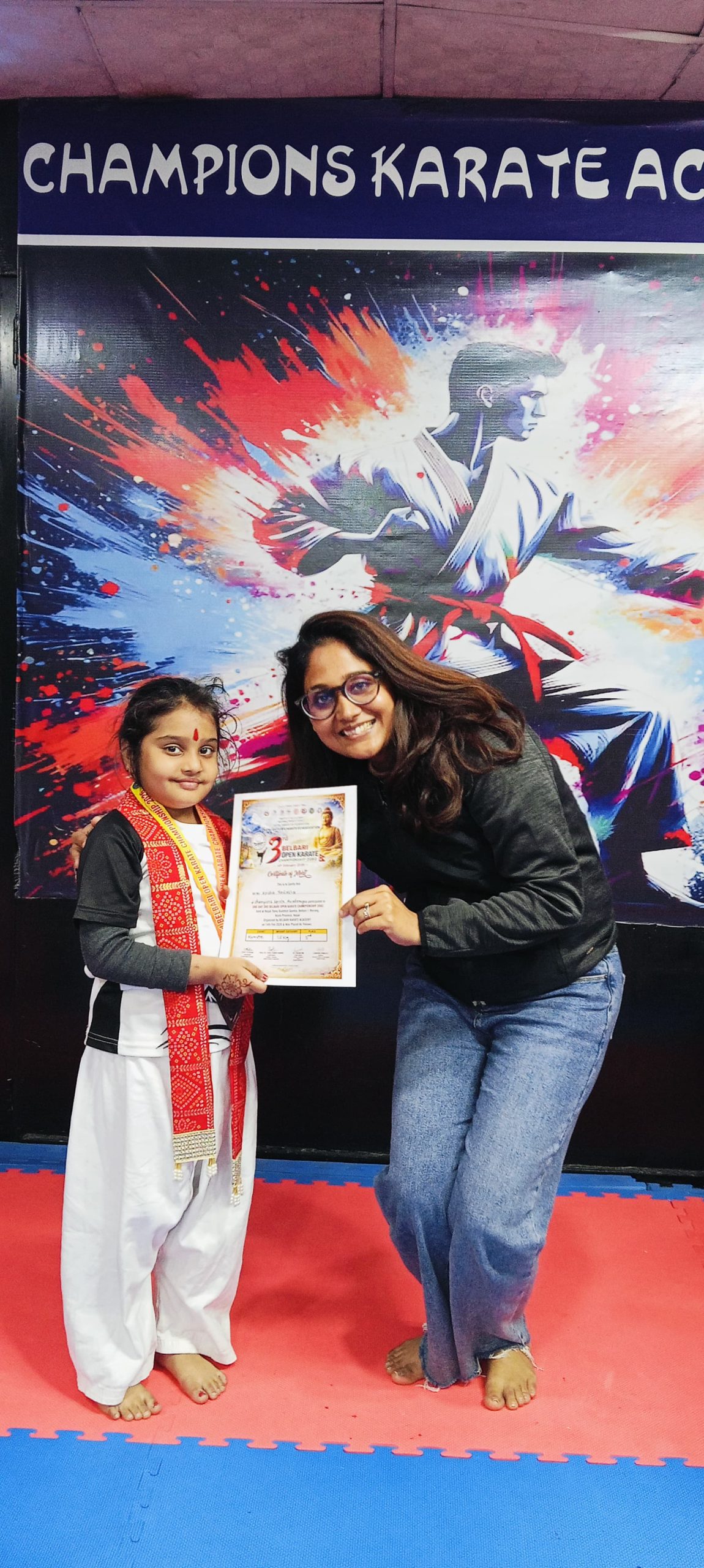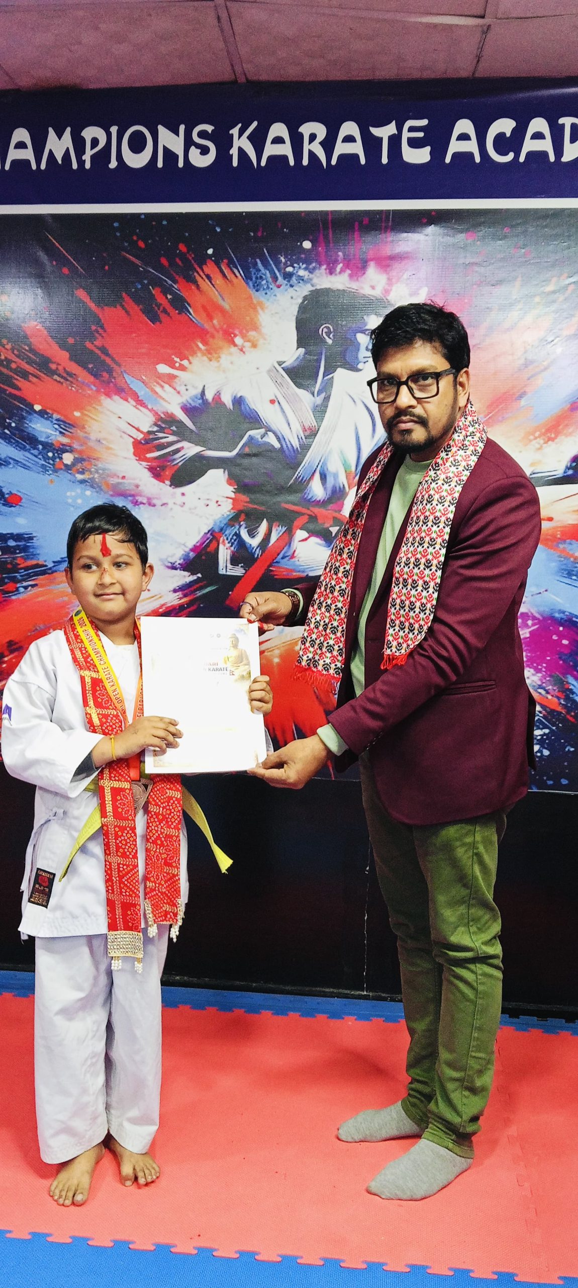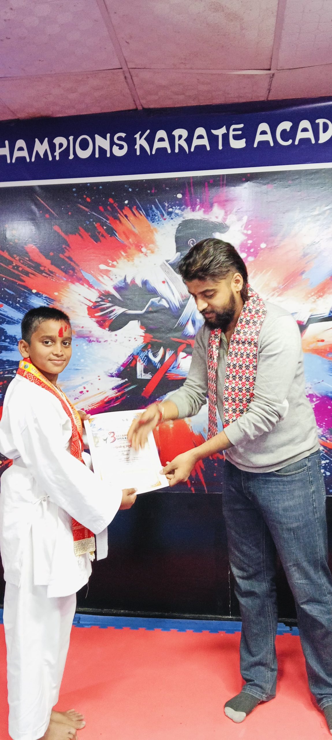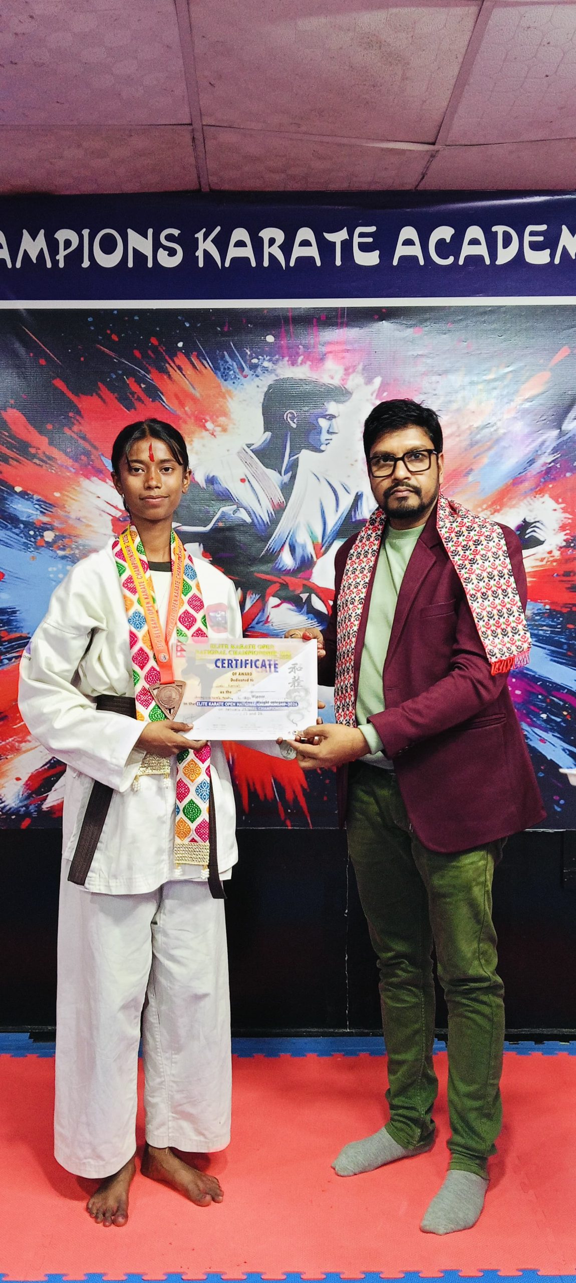 विराटनगर। विराटनगर स्थित च्याम्पियन्स कराँते एकेडेमीका खेलाडी विद्यार्थीहरूलाई एक समारोहका बीच सम्मान गरिएको छ। खेलाडीहरूलाई पारस मल्टिस्पेसिलिटी अस्पतालका प्रमुख कार्यकारी अधिकृत हेम नारायण मेहता र अस्पतालका लेखा प्रमुख इमरान अन्सारी तथा रोडशेष डेन्टल तथा ओरल केयर क्लिनिकका डा. शेखर कुमार मण्डलले खादा, टिका, मेडल तथा प्रमाणपत्र प्रदान गर्दै सम्मान गरेका हुन्।
