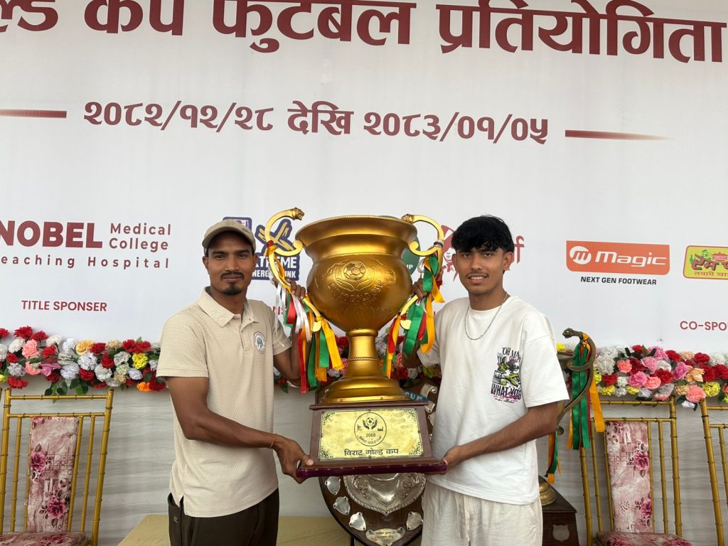 विराटनगर । विराटनगरमा जारी ३८ औं संस्करणको नोबेल विराट गोल्डकपको उपाधिका लागि पूर्व विजेता झापा – ११ र घरेलु टोली सम्राट स्पोर्टिङ क्लब भिड्दैछन् ।